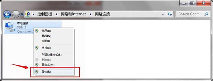 右键点击当前活动的网络连接,点弹出菜单中的 [属性]。